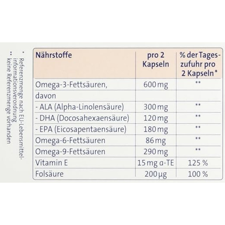 مواد مغذی: اسیدهای چرب امگا ۳ (ALA آلفا لینولنیک اسید، DHA دوکوزاهگزانوئیک اسید، EPA ایکوزاپنتانوئیک اسید)، اسیدهای چرب امگا ۶، اسیدهای چرب امگا ۹، ویتامین E، اسید فولیک