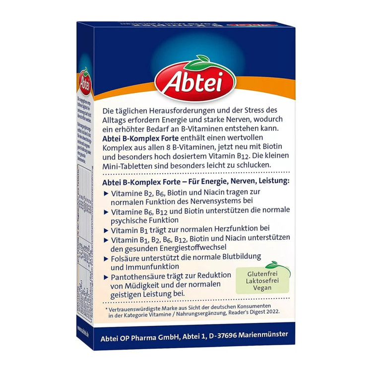 چالشها و استرسهای روزمره زندگی، انرژی و اعصاب قوی میطلبد که میتواند منجر به افزایش نیاز به ویتامینهای گروه B شود. Abtei B-Complex Forte حاوی ترکیبی از هر هشت ویتامین گروه B است که اکنون بیوتین و دوز بالایی از ویتامین B12 نیز به آن اضافه شده است . این مینی قرصهای کوچک به راحتی بلعیده میشوند.
