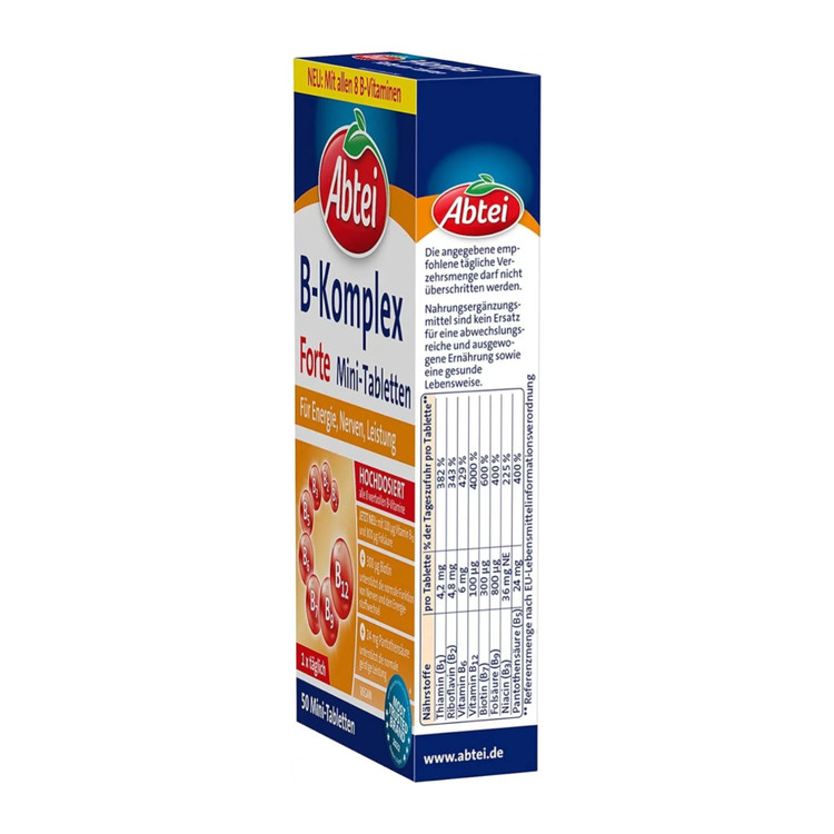 چالشها و استرسهای روزمره زندگی، انرژی و اعصاب قوی میطلبد که میتواند منجر به افزایش نیاز به ویتامینهای گروه B شود. Abtei B-Complex Forte حاوی ترکیبی از هر هشت ویتامین گروه B است که اکنون بیوتین و دوز بالایی از ویتامین B12 نیز به آن اضافه شده است . این مینی قرصهای کوچک به راحتی بلعیده میشوند.