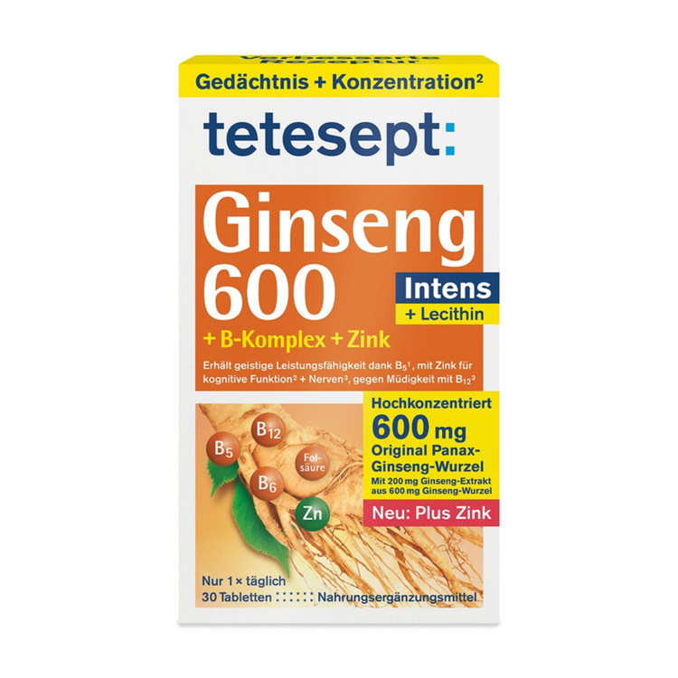 به لطف فرمول بهبود یافته آن با ویتامینهای گروه B و روی، tetesept Ginseng 600 Intens از عملکرد ذهنی¹، سیستم عصبی³ و عملکرد روانی⁴ پشتیبانی میکند.