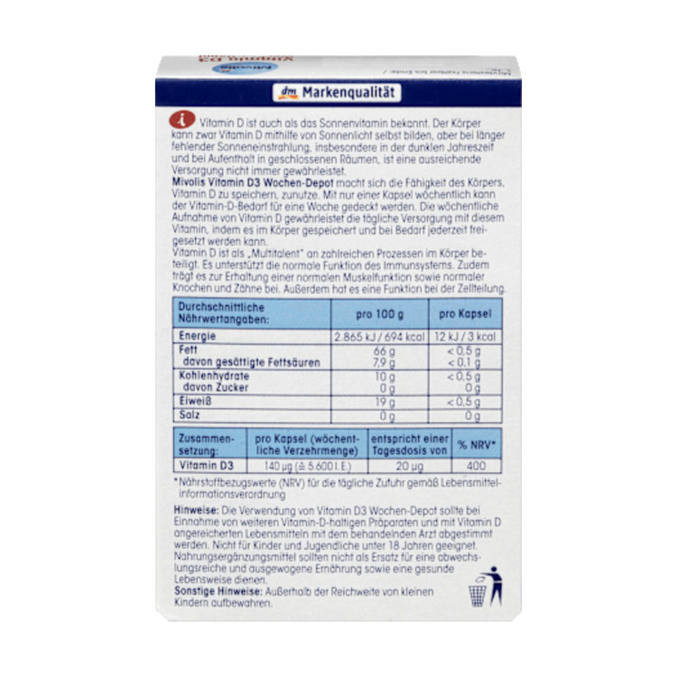 کپسول هفتگی میوولیس ویتامین D3 از توانایی بدن در ذخیره ویتامین D استفاده میکند. فقط یک کپسول در هفته، نیاز ویتامین D شما را به مدت یک هفته تأمین میکند. مصرف هفتگی، تأمین روزانه این ویتامین را تضمین میکند، زیرا در بدن ذخیره شده و در صورت نیاز آزاد میشود. *بستهبندی حاوی حداقل 70٪ مواد بازیافتی است.