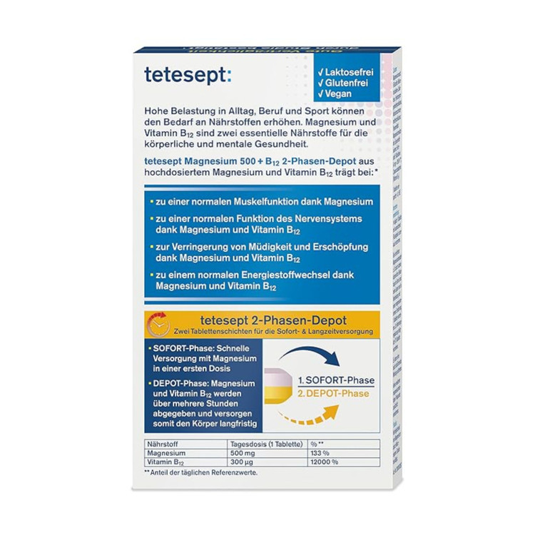 محتویات جعبه: ۵ عدد قرص ۳۰ عددی منیزیم ۵۰۰ + ویتامین B12 دپو از تِتِسپِت / مکمل برای عضلات، اعصاب و متابولیسم انرژی* - بدون لاکتوز، بدون گلوتن، وگان.