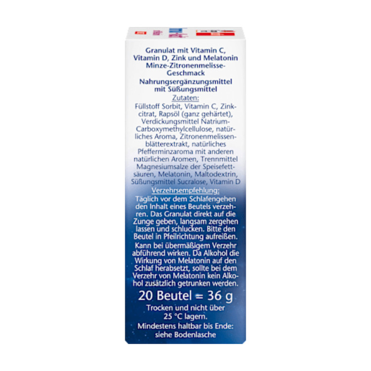 ایمون + نایت دایرکت از شرکت دوپلهرز، ملاتونین، ویتامین C، ویتامین D و روی را در گرانولهای استیک با طعم نعناع و بادرنجبویه ارائه میدهد. ملاتونین میتواند با مصرف ۱ میلیگرم کمی قبل از خواب، به کوتاه شدن زمان لازم برای به خواب رفتن کمک کند. ویتامین C، ویتامین D و روی هر کدام میتوانند به عملکرد طبیعی سیستم ایمنی بدن کمک کنند. این گرانولها را میتوان به راحتی در هر زمانی بدون نیاز به مایع مصرف کرد و به ویژه برای استفاده قبل از خواب مناسب هستند.