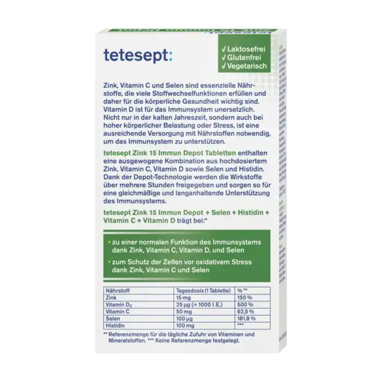تِتِسِپت زینک ۱۵ ایمیون دپو (tetesept Zinc 15 Immune Depot) یک مکمل غذایی برای تقویت سیستم دفاعی بدن، سیستم ایمنی و محافظت از سلولهای اکسیداتیو است. این مکمل حاوی ترکیبی متعادل از دوز بالای روی، ویتامین C، ویتامین D، سلنیوم و هیستیدین است. به لطف فناوری دپو، مواد مؤثر آن طی چند ساعت آزاد میشوند و پشتیبانی مداوم و طولانیمدت از سیستم ایمنی را فراهم میکنند.