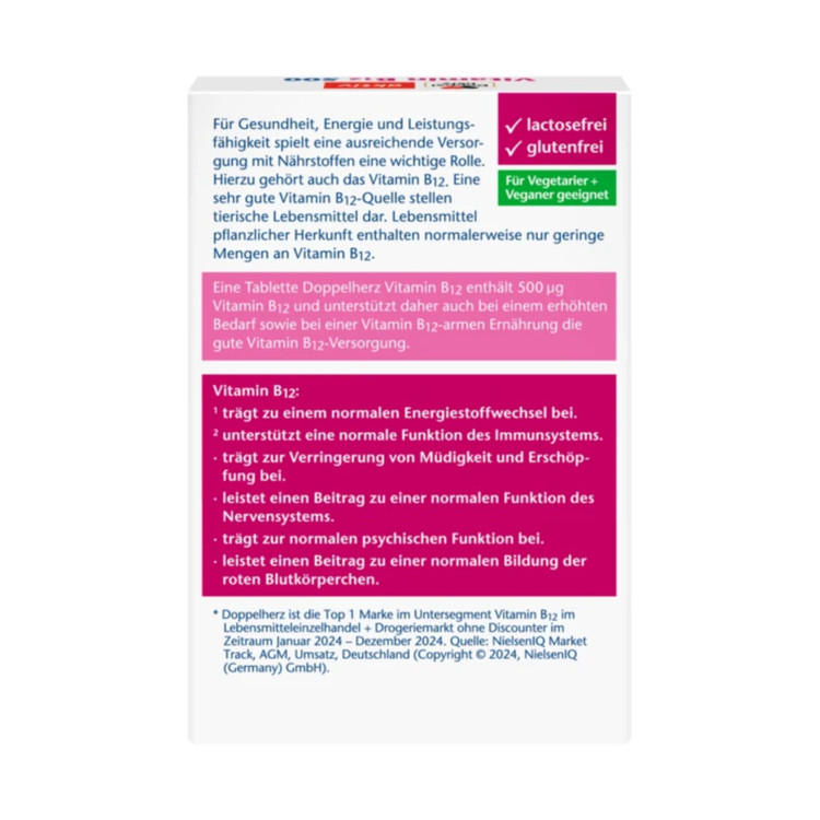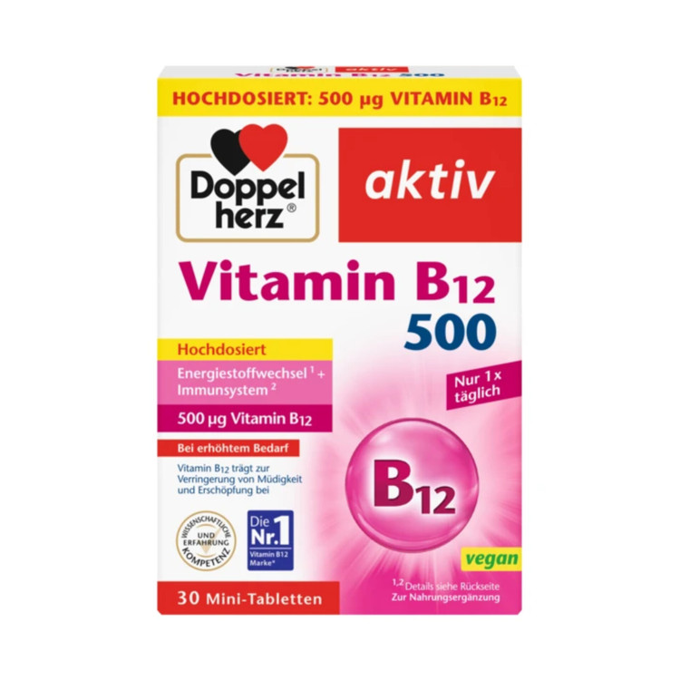 بدن انسان نمیتواند خود ویتامین B12 را تولید کند و باید آن را از طریق غذا دریافت کند. برای نیازهای بیشتر، مانند دوران پیری یا به دلیل رژیم غذایی کاملاً وگان، مکملهای Doppelherz توصیه میشوند. یک مینی قرص حاوی ۵۰۰ میکروگرم ویتامین B12 با دوز بالا است و بنابراین به تأمین کافی این ویتامین کمک میکند. به سادگی روزانه یک مینی قرص را با مقدار زیادی آب مصرف کنید.