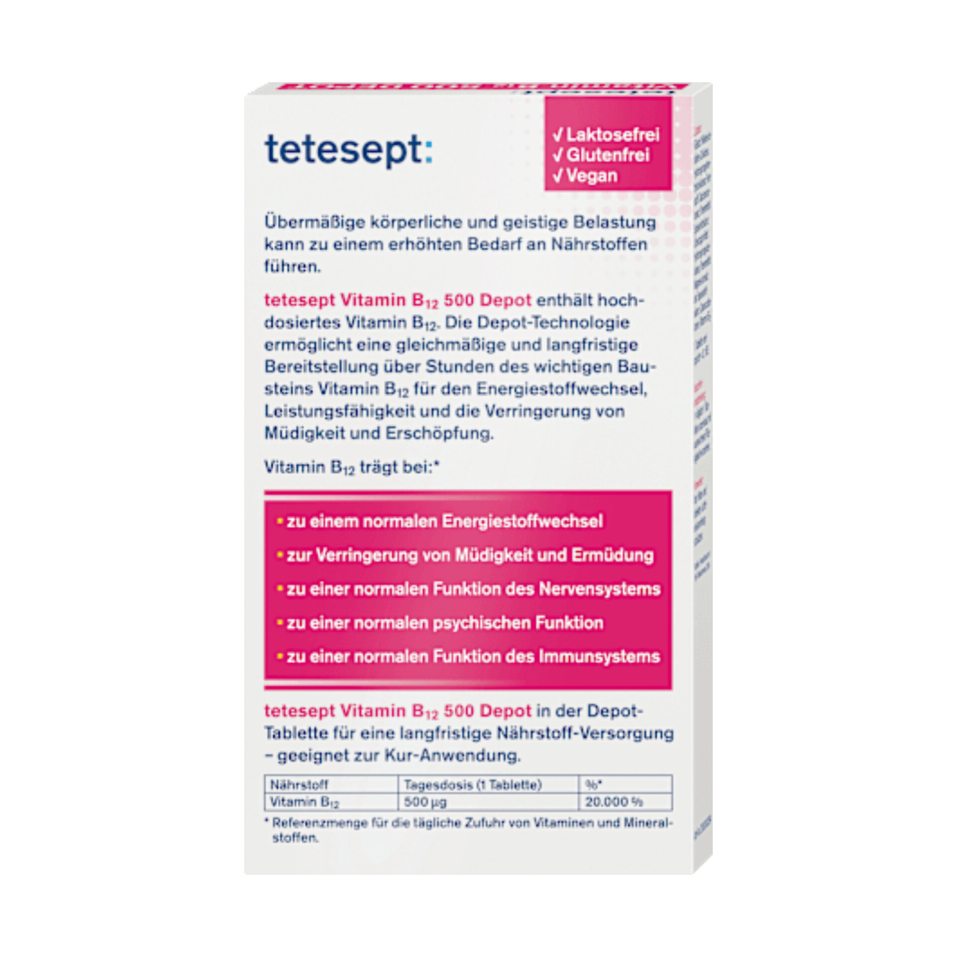 مینی قرصهای ویتامین B12 دپو ۵۰۰ میکروگرمی تِتِسپِت، یک مکمل غذایی برای پشتیبانی و تأمین طولانیمدت سوخت و ساز طبیعی انرژی - برای بدن و ذهن - هستند.*