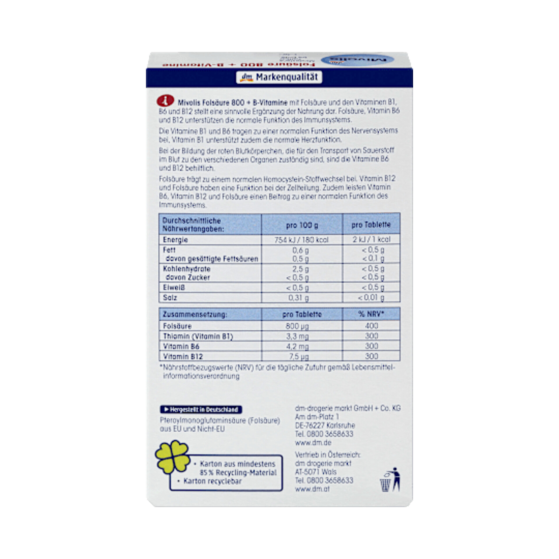 قرصهای میوولیس فولیک اسید ۸۰۰+ ویتامینهای گروه B میتوانند سیستم ایمنی بدن را به طور قابل توجهی تقویت کرده و به طور قابل توجهی از تشکیل خون و تقسیم سلولی پشتیبانی کنند. ویتامینهای B1، B6 و B12 میتوانند طیف وسیعی از عملکردها و فرآیندهای بدن را تقویت کنند. آنها میتوانند به عملکرد طبیعی قلب کمک کرده و عملکرد طبیعی سیستم عصبی را تقویت کنند، ضمن اینکه به تشکیل گلبولهای قرمز خون نیز کمک میکنند. این گلبولها مسئول انتقال اکسیژن به اندامهای مختلف هستند. این مکمل غذایی همچنین میتواند از متابولیسم طبیعی هموسیستئین پشتیبانی کند. هموسیستئین یک اسید آمینه است که تنها از طریق رژیم غذایی به دست نمیآید. برای رفاه عمومی!