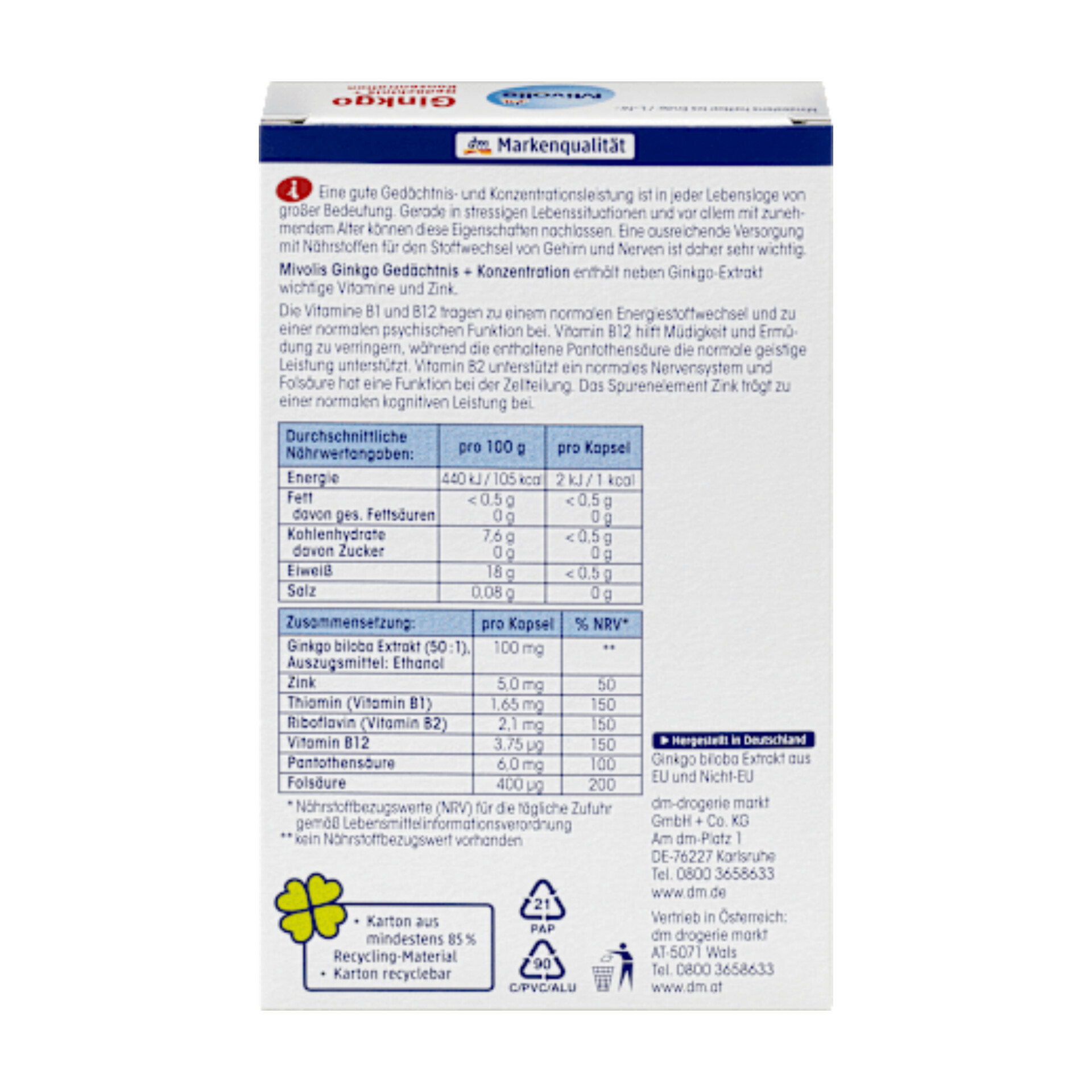 مکمل حافظه و تمرکز جینکو میولیس حاوی عصاره جینکو، ویتامینهای مهم و روی است. ویتامینهای B1 و B12 میتوانند به متابولیسم طبیعی انرژی و عملکرد طبیعی روانی کمک کنند. ویتامین B12 میتواند به کاهش خستگی و کوفتگی کمک کند، در حالی که اسید پانتوتنیک موجود در آن میتواند از عملکرد طبیعی ذهنی پشتیبانی کند. ویتامین B2 میتواند از سیستم عصبی طبیعی پشتیبانی کند. عنصر کمیاب روی میتواند به عملکرد طبیعی شناختی کمک کند.