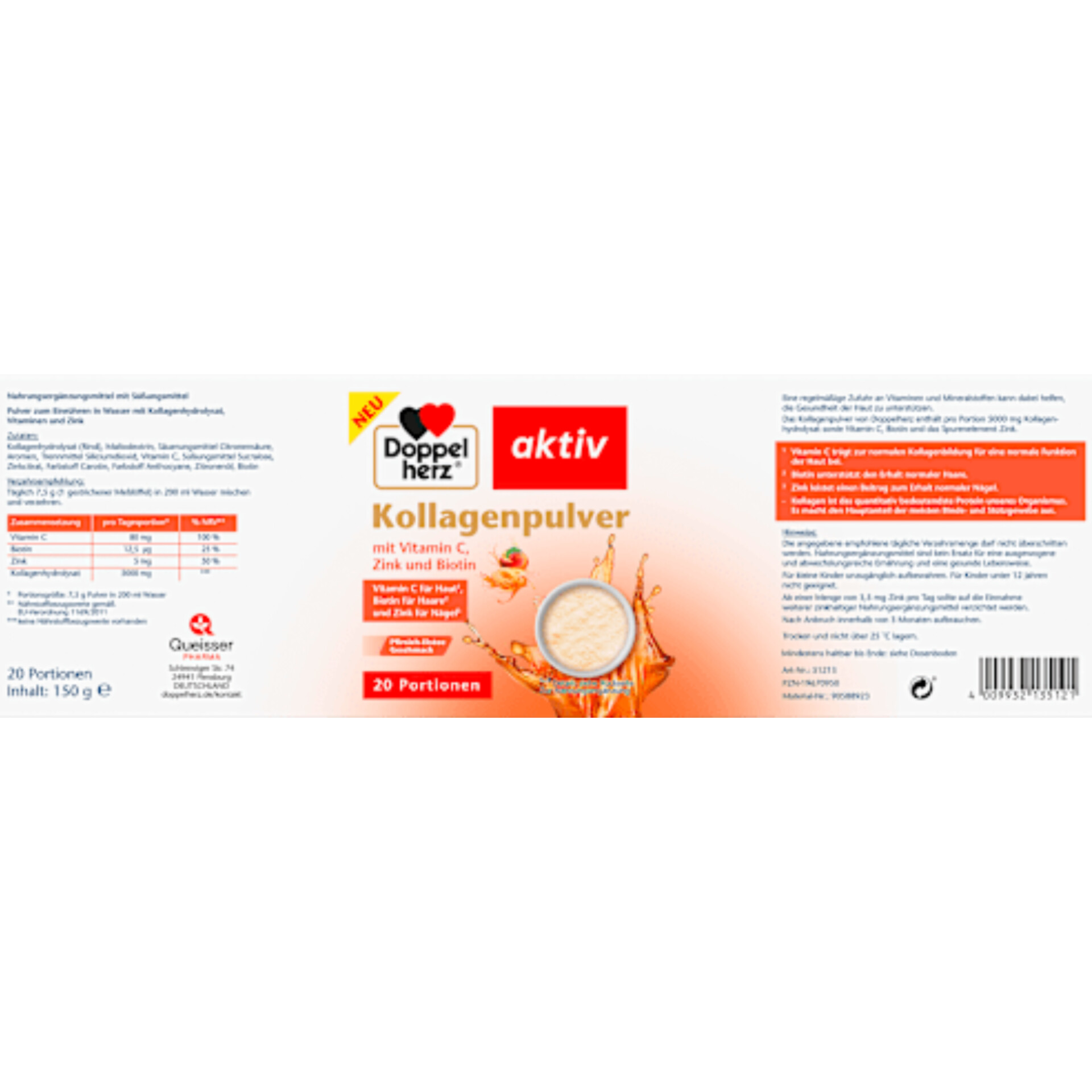 پودر کلاژن هلو Doppelherz پودری است که با آب مخلوط میشود و با طعم هلوی دلچسب خود، توجه را به خود جلب میکند. هر وعده روزانه ۵۰۰۰ میلیگرم کلاژن هیدرولیزات و همچنین ترکیبی از ویتامین C، بیوتین و روی را فراهم میکند. ویتامین C موجود در آن میتواند به تشکیل طبیعی کلاژن کمک کند، در حالی که بیوتین میتواند از حفظ موهای طبیعی پشتیبانی کند. این پودر کلاژن برای تکمیل یک رژیم غذایی متعادل روزانه ایدهآل است و میتواند به حفظ سلامت پوست و مو کمک کند.