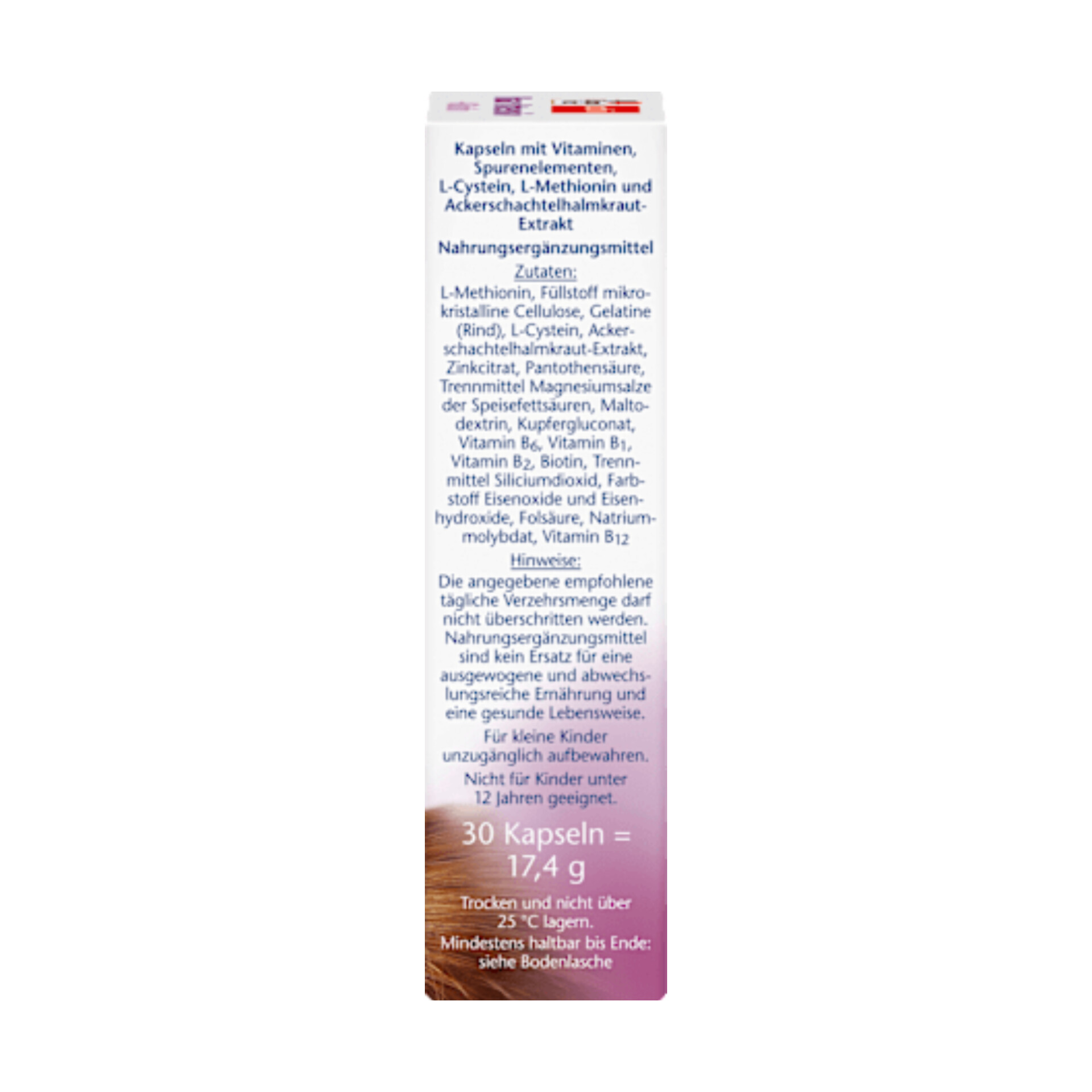 کپسولهای Doppelherz Hair Intensive + Biotin به لطف بیوتین و روی موجود در خود میتوانند به حفظ موهای طبیعی کمک کنند. مس موجود در آنها میتواند از رنگدانه طبیعی مو پشتیبانی کند. اسید فولیک و ویتامین B12 نقش مهمی در تقسیم سلولی دارند. ویتامینهای B1، B2 و اسید پانتوتنیک موجود در آنها میتوانند به متابولیسم انرژی کمک کنند. ویتامین B6 میتواند به سنتز طبیعی سیستئین کمک کند. عنصر کمیاب مولیبدن میتواند به متابولیسم طبیعی اسیدهای آمینه حاوی گوگرد کمک کند.