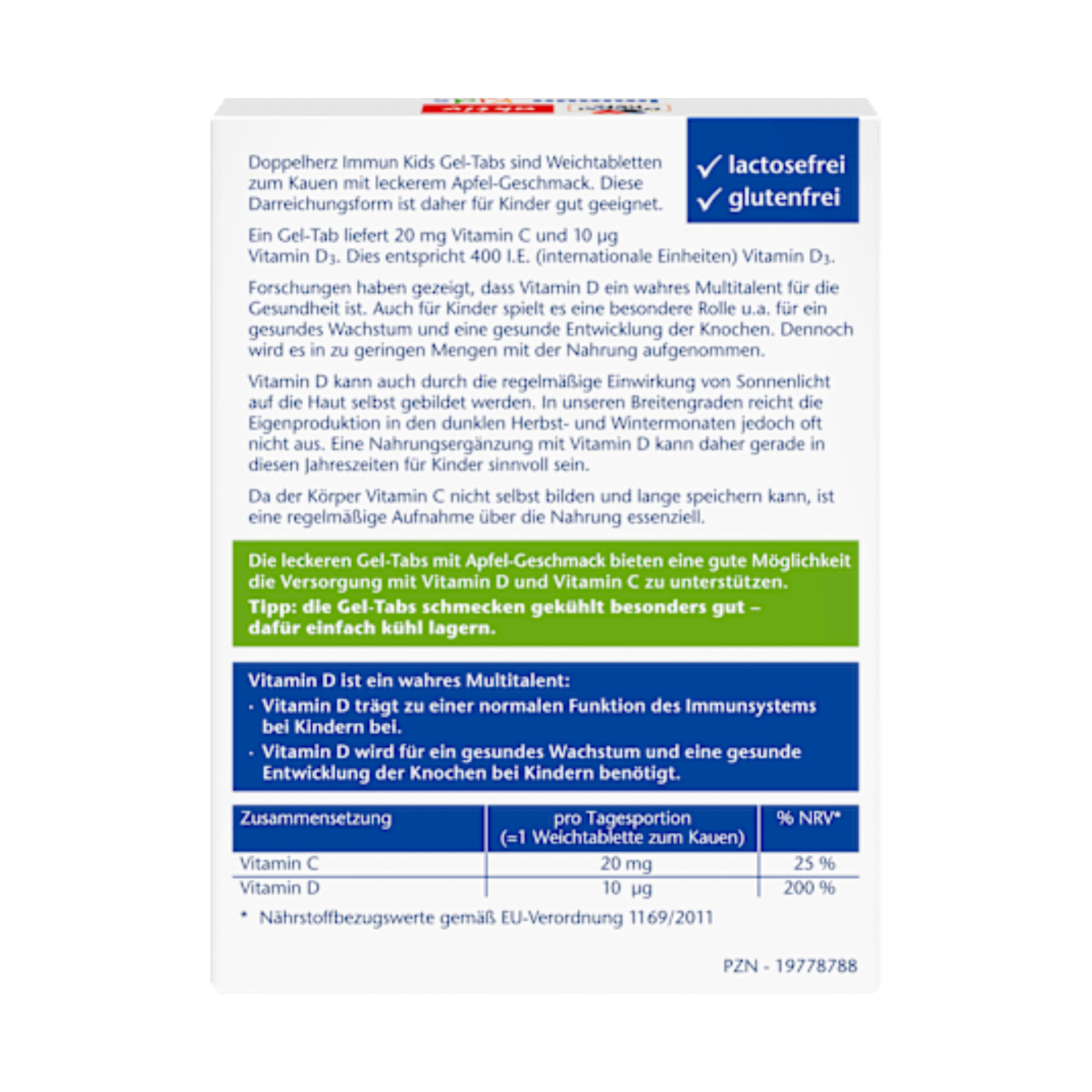 قرصهای ژلهای Doppelherz Immun Kids، قرصهای نرم جویدنی هستند که مخصوص کودکان تولید شدهاند و طعم سیب میوهای خوشمزهای دارند. این فرمول حاوی مواد مغذی منتخب مانند ویتامین D است که میتواند به عملکرد طبیعی سیستم ایمنی بدن کمک کند. ویتامین D همچنین میتواند به رشد و نمو طبیعی استخوان در کودکان کمک کند. قرصهای ژلهای Doppelherz همچنین حاوی ویتامین C و اسیدهای چرب امگا 3 هستند.