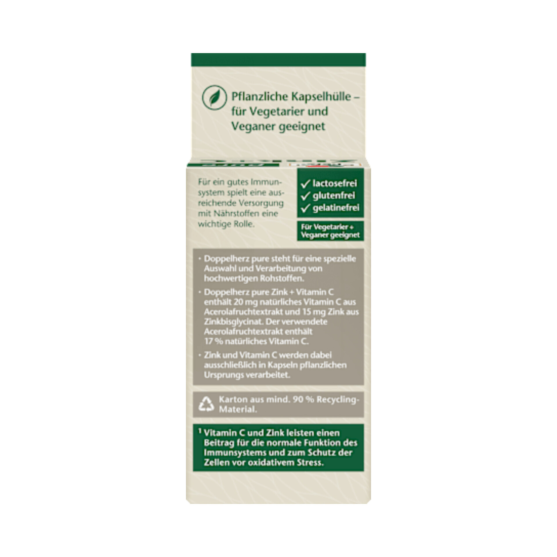 کپسولهای خالص زینک + سی دوپلهرز با روی و ویتامین سی طبیعی از گیلاسهای آسرولا غنی شدهاند و به محافظت از سلولها در برابر استرس اکسیداتیو کمک کرده و به عملکرد طبیعی سیستم ایمنی بدن کمک میکنند. به لطف پوسته کپسول گیاهی و عدم وجود ژلاتین، این کپسولها برای گیاهخواران و وگانها نیز مناسب هستند. آنها همچنین بدون لاکتوز و گلوتن هستند. *