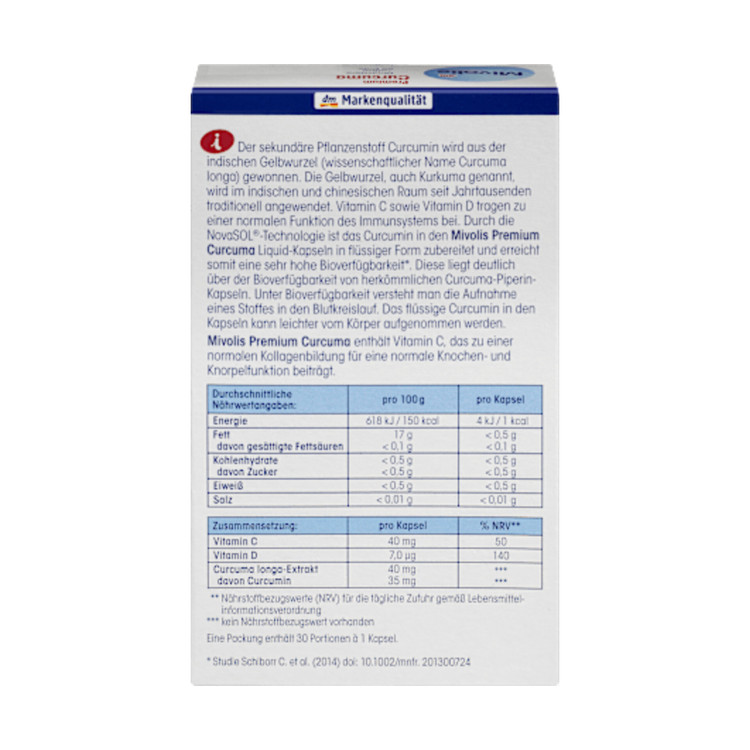 کپسولهای زردچوبه Mivolis Premium حاوی کورکومین ارزشمند و همچنین ویتامینهای C و D هستند. کورکومین از زردچوبه گرفته شده و به لطف فناوری ویژه NovaSOL، درون کپسولها به صورت مایع درآمده است. این امر فراهمی زیستی بالا را تضمین میکند و به بدن اجازه میدهد تا فرم مایع را راحتتر جذب کند. ویتامینهای C و D میتوانند به عملکرد طبیعی سیستم ایمنی بدن کمک کنند. علاوه بر این، این مکمل غذایی میتواند به تشکیل طبیعی کلاژن برای سلامت استخوانها و غضروفها کمک کند.