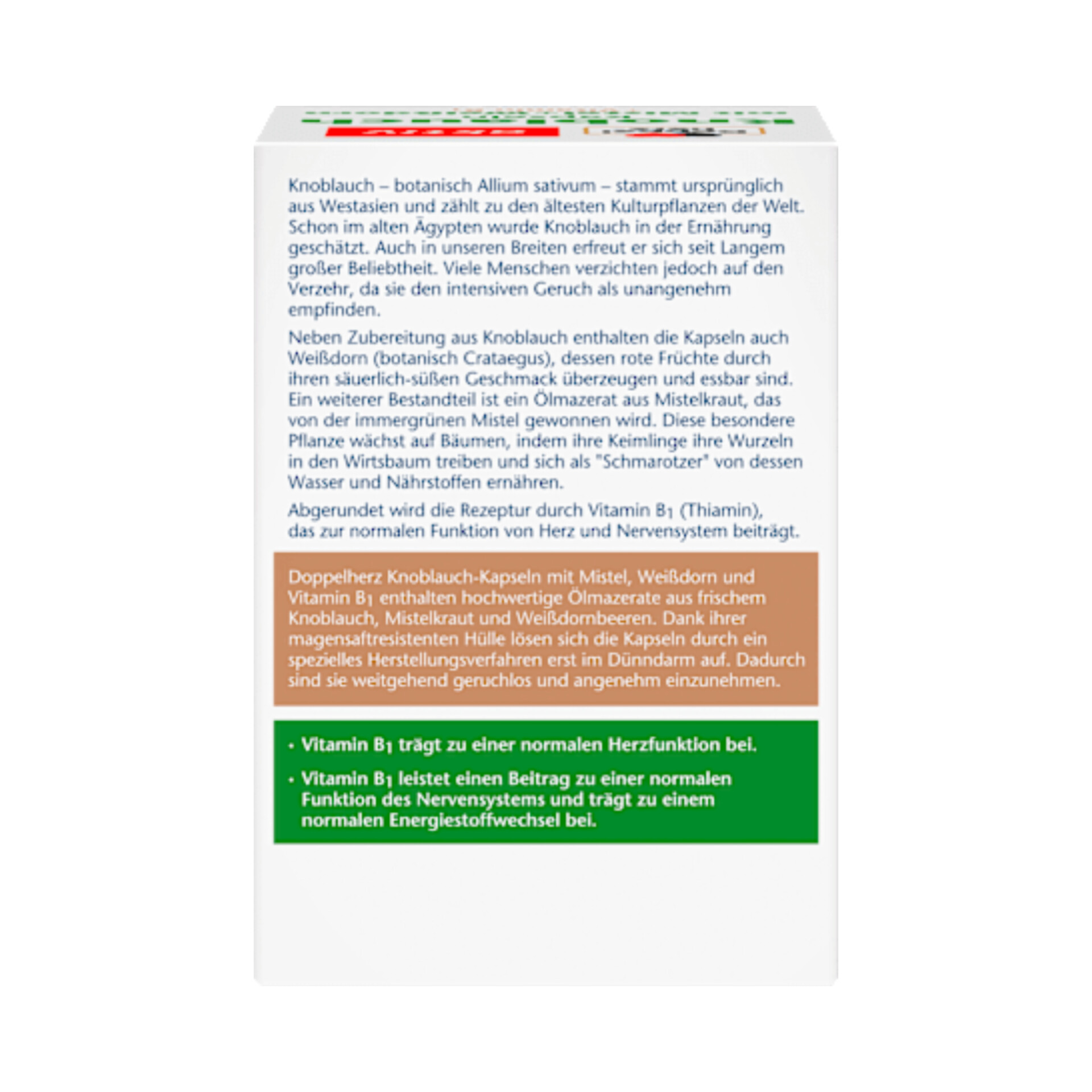 کپسولهای سیر دوپلهرز حاوی ترکیبی از روغنهای خیسانده شده سیر، دارواش و زالزالک به همراه ویتامین B1 هستند. ویتامین B1 (تیامین) میتواند به عملکرد طبیعی قلب کمک کند. نگران بوی نامطبوع سیر نباشید؛ کپسولهای روکشدار رودهای فقط در روده کوچک حل میشوند و همین امر باعث میشود که تا حد زیادی بیمزه و بیبو باشند.