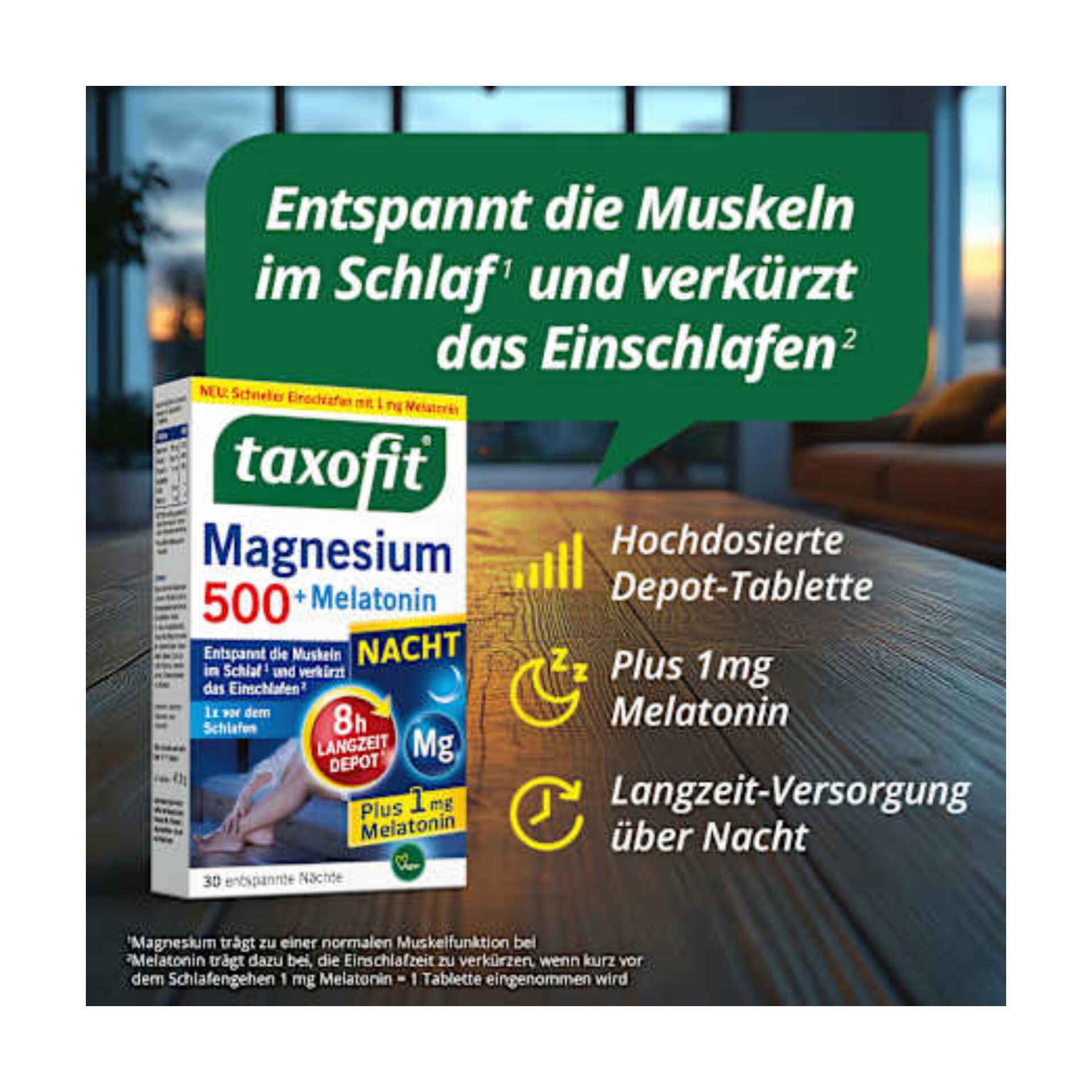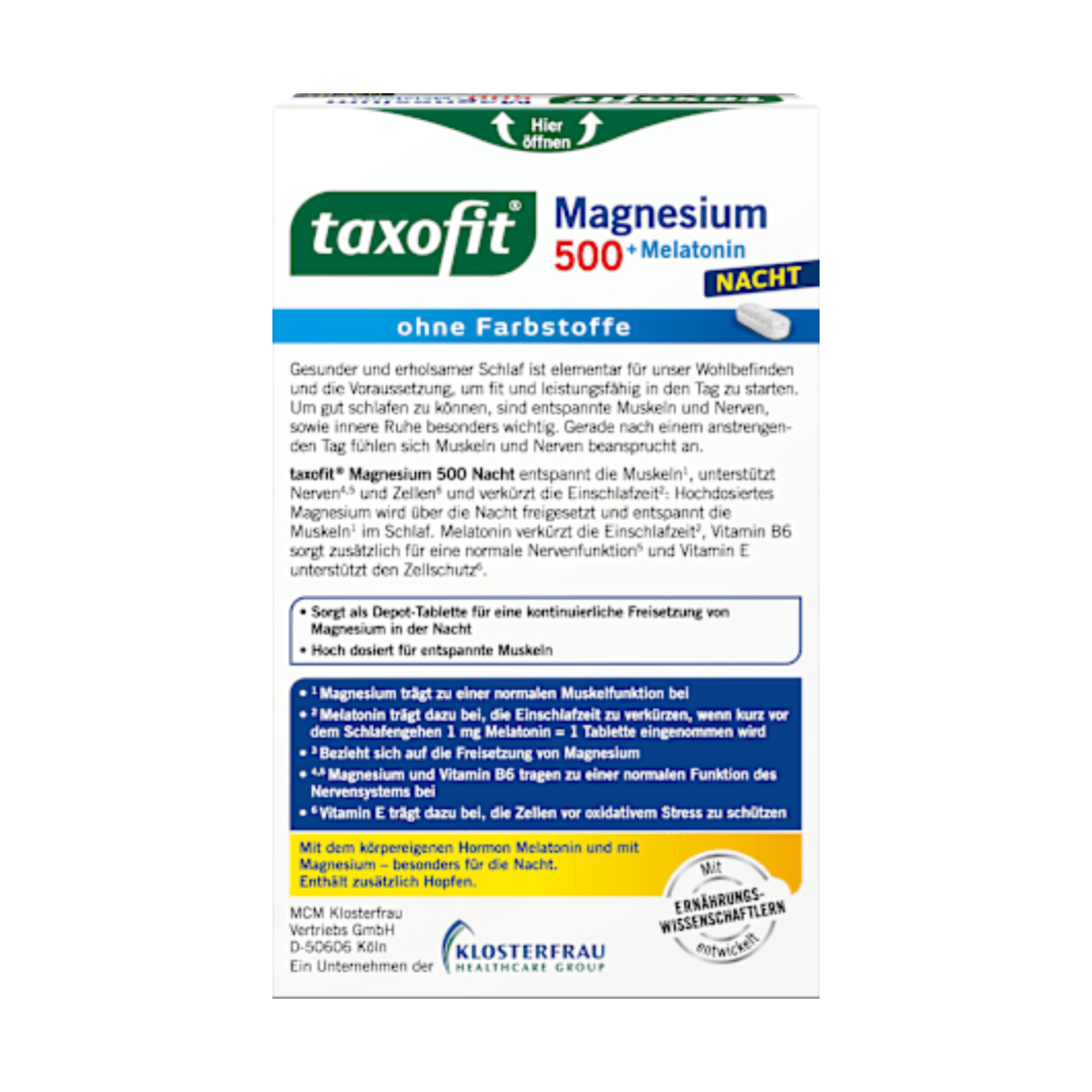 قرصهای تاکسوفیت منیزیم نایت ۵۰۰ پلاس ملاتونین میتوانند خواب آرام و سالم و همچنین حس خوشایند تندرستی را تقویت کنند. دوز بالای منیزیم موجود در آنها در طول شب آزاد میشود و در نتیجه عضلات را در طول خواب شل میکند. رازک به خوابیدن کمک میکند و ویتامین B6 میتواند به عملکرد طبیعی اعصاب کمک کند. محافظت از سلولها توسط ویتامین E موجود در این محصول بیشتر پشتیبانی میشود.