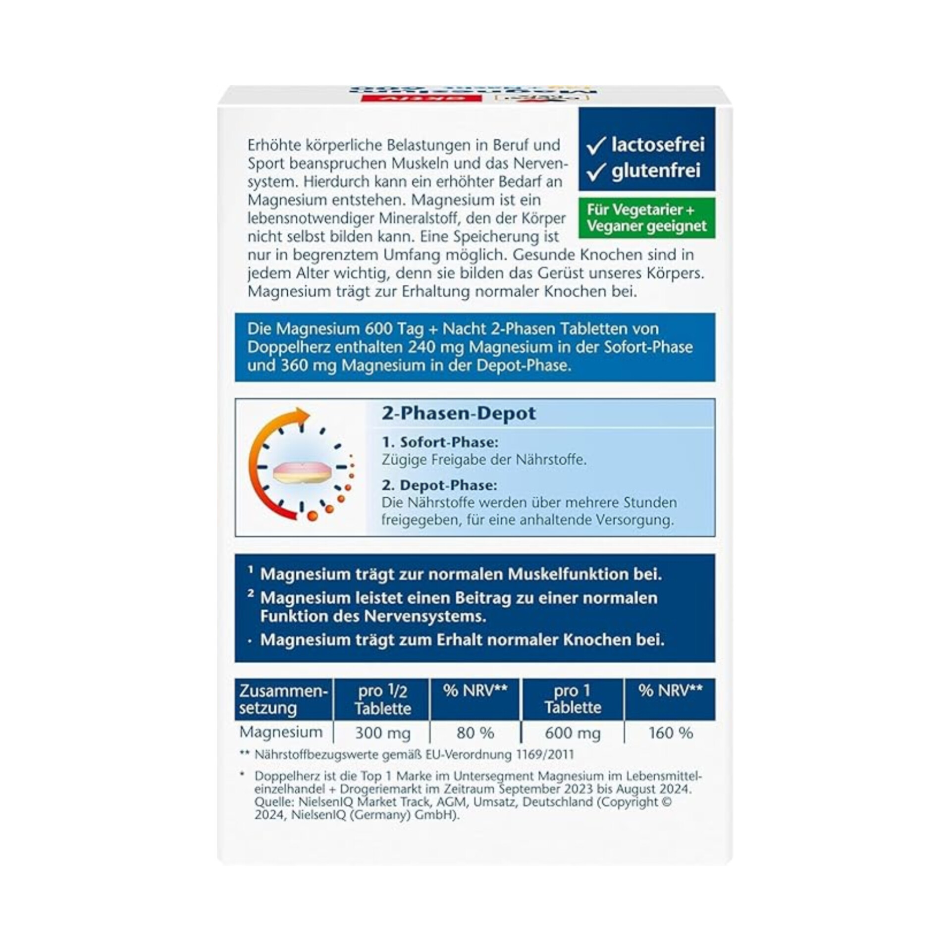 بدون لاکتوز، بدون گلوتن و وگان: قرص منیزیم دو فاز دوپلهرتز ۶۰۰ روز + شب، بدون لاکتوز و بدون گلوتن است و همچنین برای رژیم وگان مناسب است.