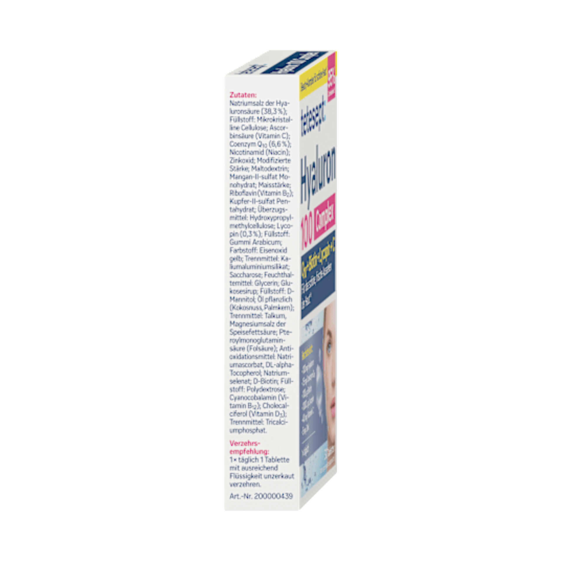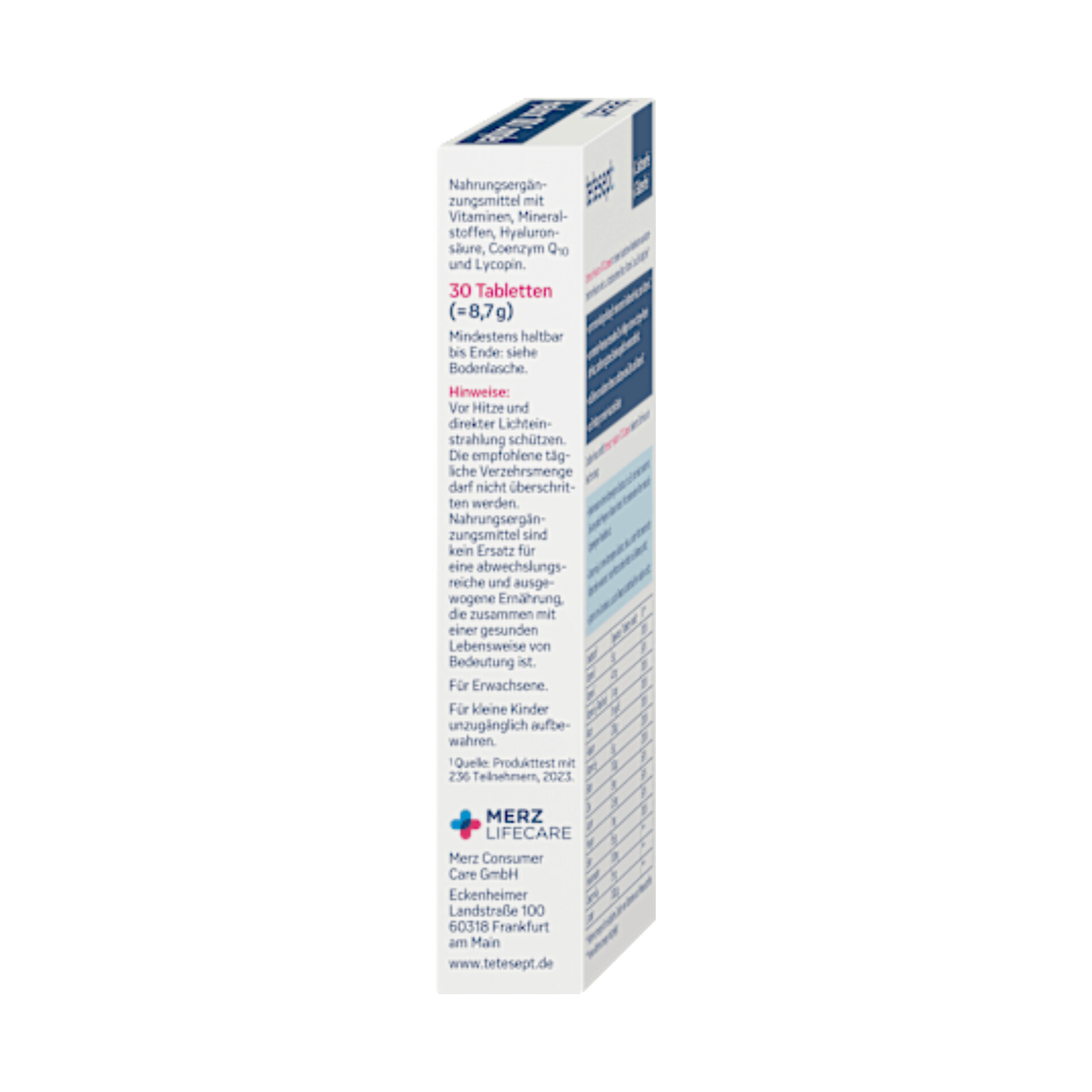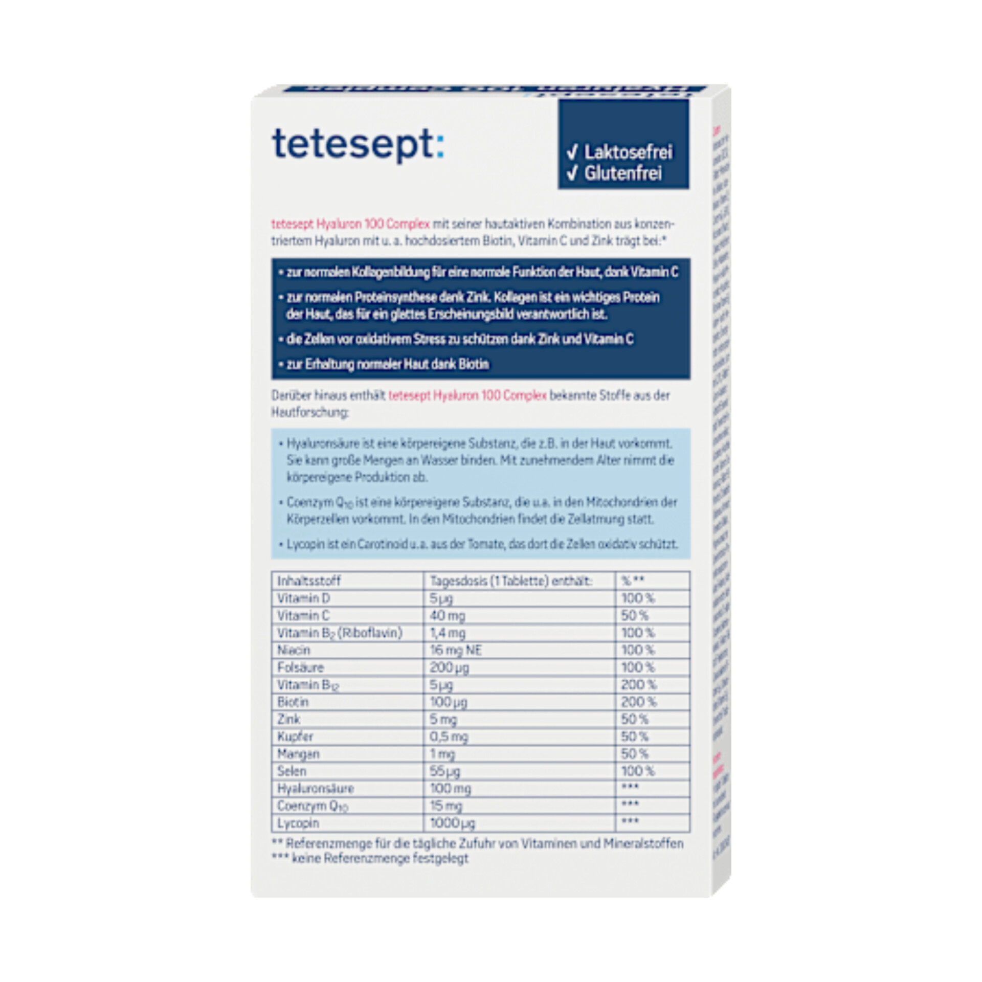 قرصهای هیالورون ۱۰۰ کمپلکس تتسپت حاوی ترکیبی از اسید هیالورونیک غلیظ به همراه بیوتین با دوز بالا، ویتامین C و روی هستند. ویتامین C به تشکیل طبیعی کلاژن برای عملکرد طبیعی پوست کمک میکند و روی به سنتز طبیعی پروتئین کمک میکند. علاوه بر این، هیالورون ۱۰۰ کمپلکس تتسپت حاوی موادی است که از تحقیقات پوستی شناخته شدهاند: اسید هیالورونیک یک ماده طبیعی است که به عنوان مثال در پوست یافت میشود. میتواند مقادیر زیادی آب را به خود جذب کند. تولید خود بدن با افزایش سن کاهش مییابد. کوآنزیم Q10 یک ماده طبیعی است که از جمله در میتوکندری سلولهای بدن یافت میشود. تنفس سلولی در میتوکندری انجام میشود. لیکوپن یک کاروتنوئید است که از جمله در گوجه فرنگی یافت میشود و از سلولها در برابر اکسیداسیون محافظت میکند.