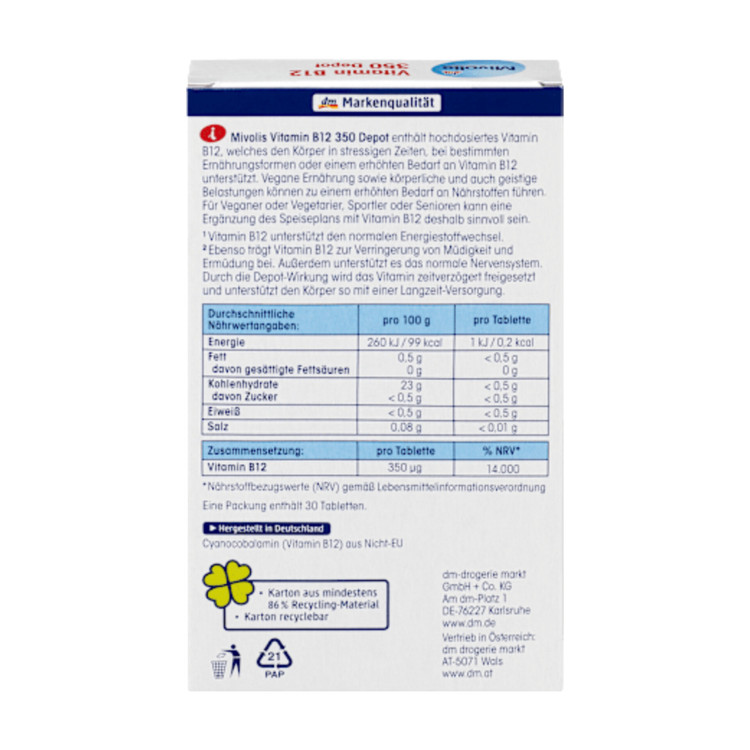 نیازهای ویتامینی شما را در طول روز پوشش میدهد. این قرصهای ویتامین B12 350 Depot بسیار غلیظ هستند و به لطف اثر Depot خود، تأمین طولانیمدتی از ویتامین را فراهم میکنند. این مکمل گیاهی به طور ویژه در اندازه بسیار کوچک برای بلع آسان فرموله شده است. ویتامین B12 همچنین میتواند به کاهش خستگی و کوفتگی کمک کند.