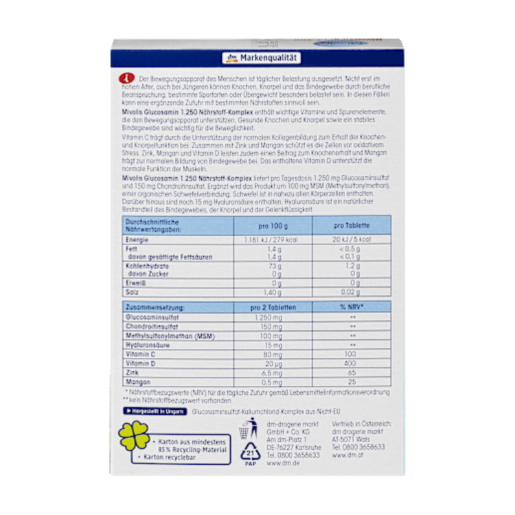 قرصهای میوولیس گلوکوزامین ۱۲۵۰ نوترینت کامپلکس ترکیبی روزانه از ویتامینها و مواد معدنی را برای بدن شما فراهم میکنند. ویتامین C موجود در آن میتواند به تشکیل کلاژن طبیعی برای عملکرد طبیعی استخوانها و غضروف کمک کند. روی و منگنز نیز میتوانند از حفظ استخوانها پشتیبانی کنند. این مکمل غذایی فاقد لاکتوز و گلوتن است.