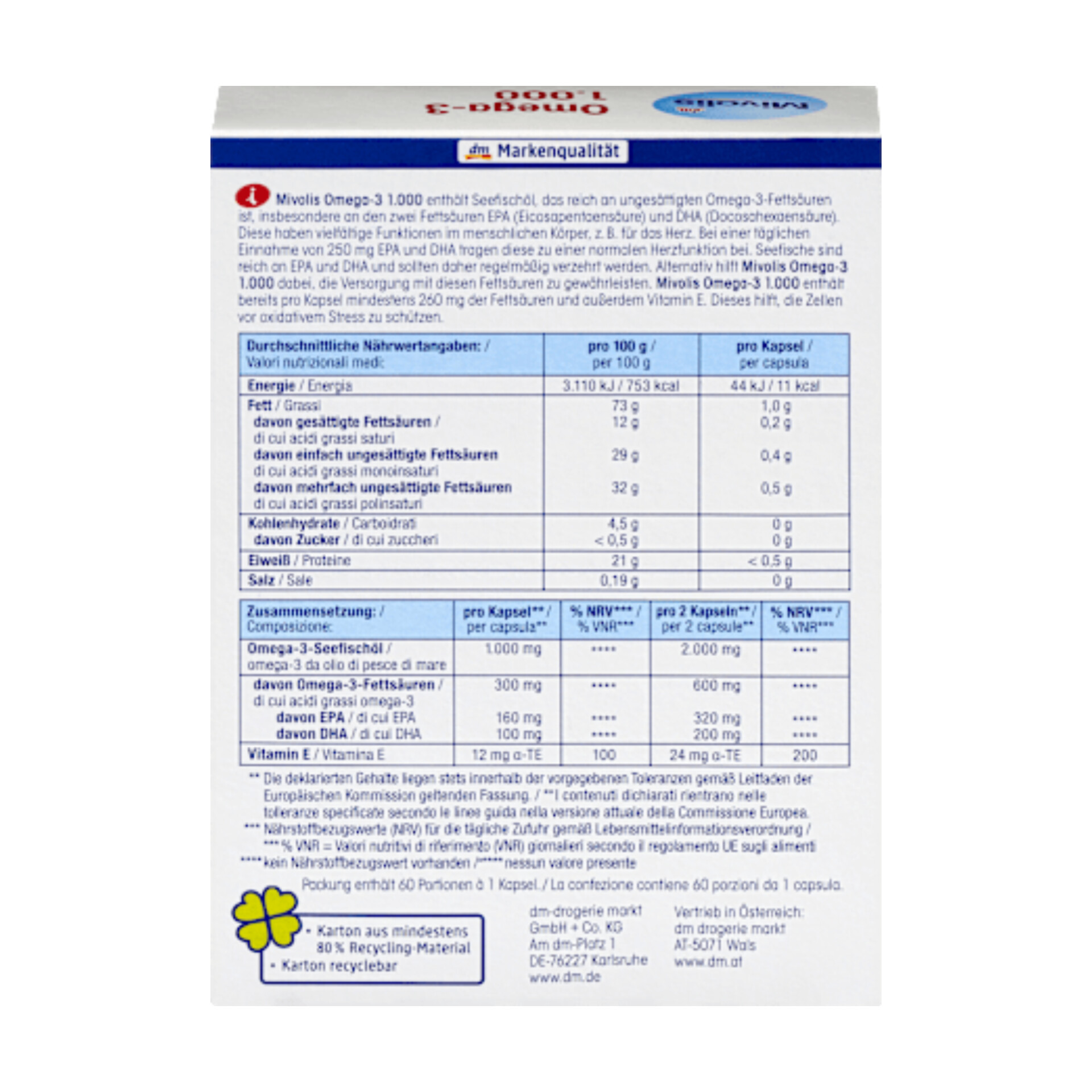 میوولیس امگا-۳ ۱۰۰۰ حاوی روغن ماهی دریایی است که سرشار از اسیدهای چرب امگا-۳ غیراشباع، به ویژه دو اسید چرب EPA (ایکوزاپنتانوئیک اسید) و DHA (دوکوزاهگزانوئیک اسید) است. این اسیدها عملکردهای متنوعی در بدن انسان دارند، به عنوان مثال، برای قلب. مصرف روزانه ۲۵۰ میلیگرم EPA و DHA به عملکرد طبیعی قلب کمک میکند. ماهیهای دریایی سرشار از EPA و DHA هستند و بنابراین باید به طور منظم مصرف شوند. از طرف دیگر، میوولیس امگا-۳ ۱۰۰۰ به تأمین کافی این اسیدهای چرب کمک میکند. هر کپسول میوولیس امگا-۳ ۱۰۰۰ حاوی حداقل ۲۶۰ میلیگرم از این اسیدهای چرب و همچنین ویتامین E است. این به محافظت از سلولها در برابر استرس اکسیداتیو کمک میکند.