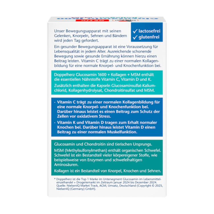 کپسولهای ویتامین C دوپلهرتز گلوکوزامین ۱۶۰۰ کلاژن MSM حاوی ویتامینهای C، D و K و همچنین کلاژن، MSM و گلوکوزامین هستند. ویتامین C میتواند به تشکیل کلاژن طبیعی برای عملکرد طبیعی غضروف و استخوان کمک کند. این کپسولها به راحتی در زندگی روزمره جای میگیرند و در مراحل فعال زندگی، پشتیبانی هدفمند ارائه میدهند.
