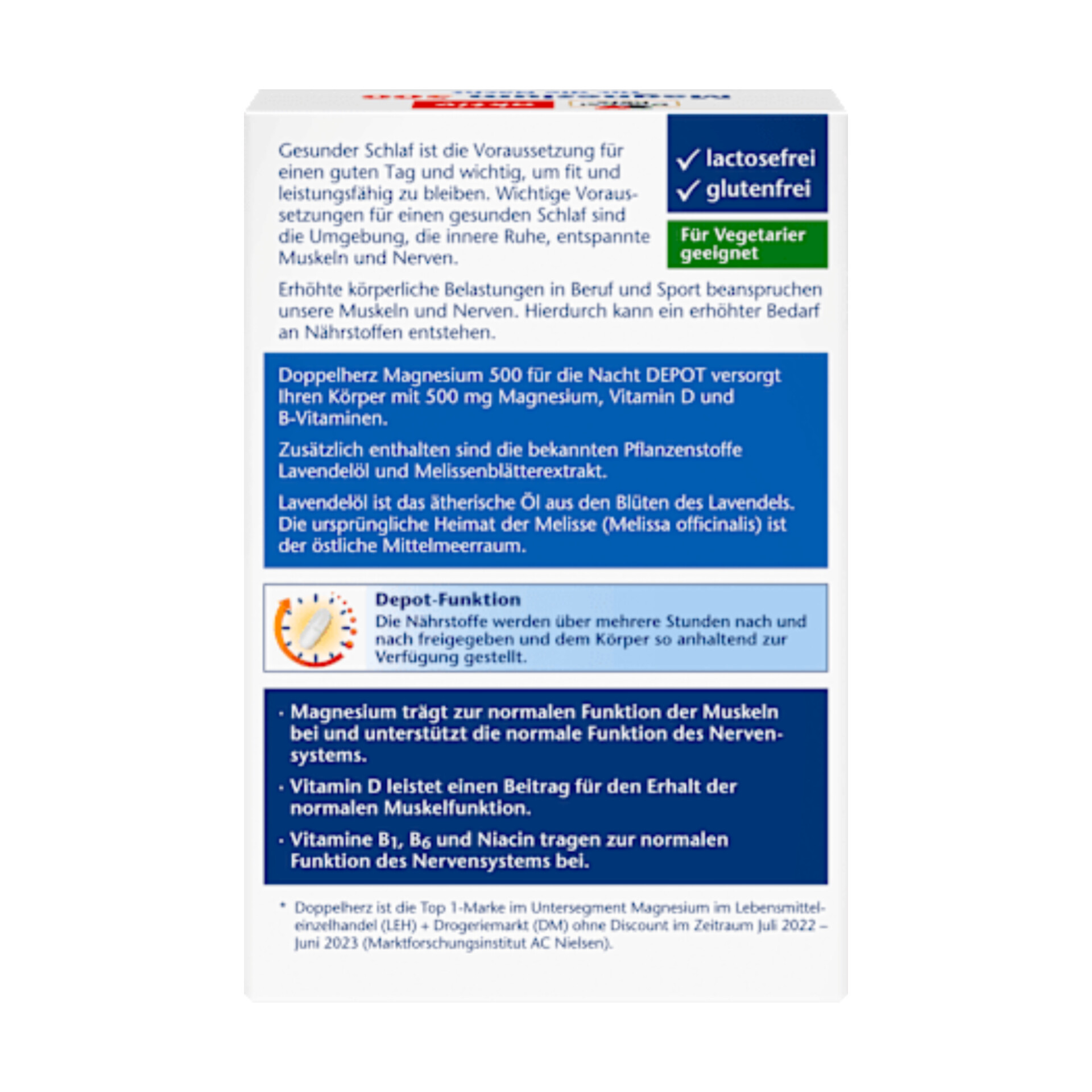 کپسولهای Doppelherz Magnesium 500 برای مصرف شبانه حاوی عصاره برگ بادرنجبویه و روغن اسطوخودوس هستند. این مکمل غذایی با دوز بالا همچنین حاوی ویتامین D و منیزیم است که از عملکرد طبیعی عضلات پشتیبانی میکنند. ویتامینهایی مانند B1، B6 و نیاسین به عملکرد طبیعی سیستم عصبی کمک میکنند. این کپسولها برای گیاهخواران مناسب هستند و همچنین فاقد لاکتوز و گلوتن میباشند.