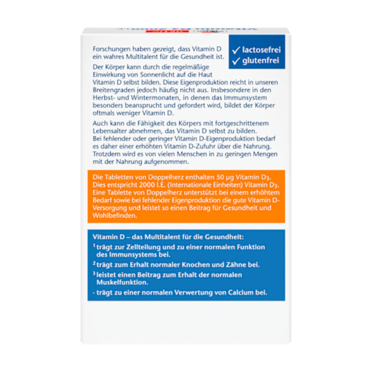 قرصهای ویتامین D3 دوپلهرز حاوی 50 میکروگرم ویتامین D3 هستند. این معادل 2000 واحد بینالمللی (IU) ویتامین D3 است. یک قرص دوپلهرز در موارد افزایش نیاز یا تولید ناکافی بدن، سطح کافی ویتامین D را پشتیبانی میکند و در نتیجه به سلامت و تندرستی کمک میکند. بدن میتواند از طریق قرار گرفتن منظم پوست در معرض نور خورشید، ویتامین D را تولید کند. با این حال، این تولید طبیعی اغلب در عرضهای جغرافیایی ما ناکافی است. بنابراین، مصرف اضافی میتواند مفید باشد، به خصوص در ماههای پاییز و زمستان که سیستم ایمنی تحت فشار خاصی قرار دارد.