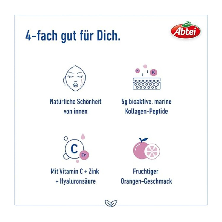 کلاژن فشرده ۵۰۰۰ Abtei Beauty – نوشیدنی زیبایی – دوز بالا – حاوی ۵ گرم پپتید کلاژن، هیالورونیک اسید، روی، ویتامین C – ۱۰