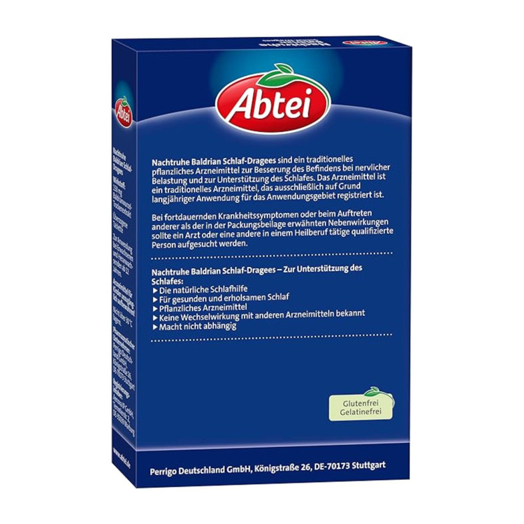 دراژههای خواب آور والرین Abtei Night rest N بدون گلوتن و ژلاتین هستند - اندازه دراژه دلپذیر است، مصرف آن آسان است - هیچ تداخلی شناخته نشده است